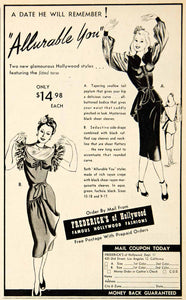 This is an original 1947 black and white print ad for two unique dresses from the "Allurable You" line at Frederick's of Hollywood, which was located at 420 Ord Street, Los Angeles, California.