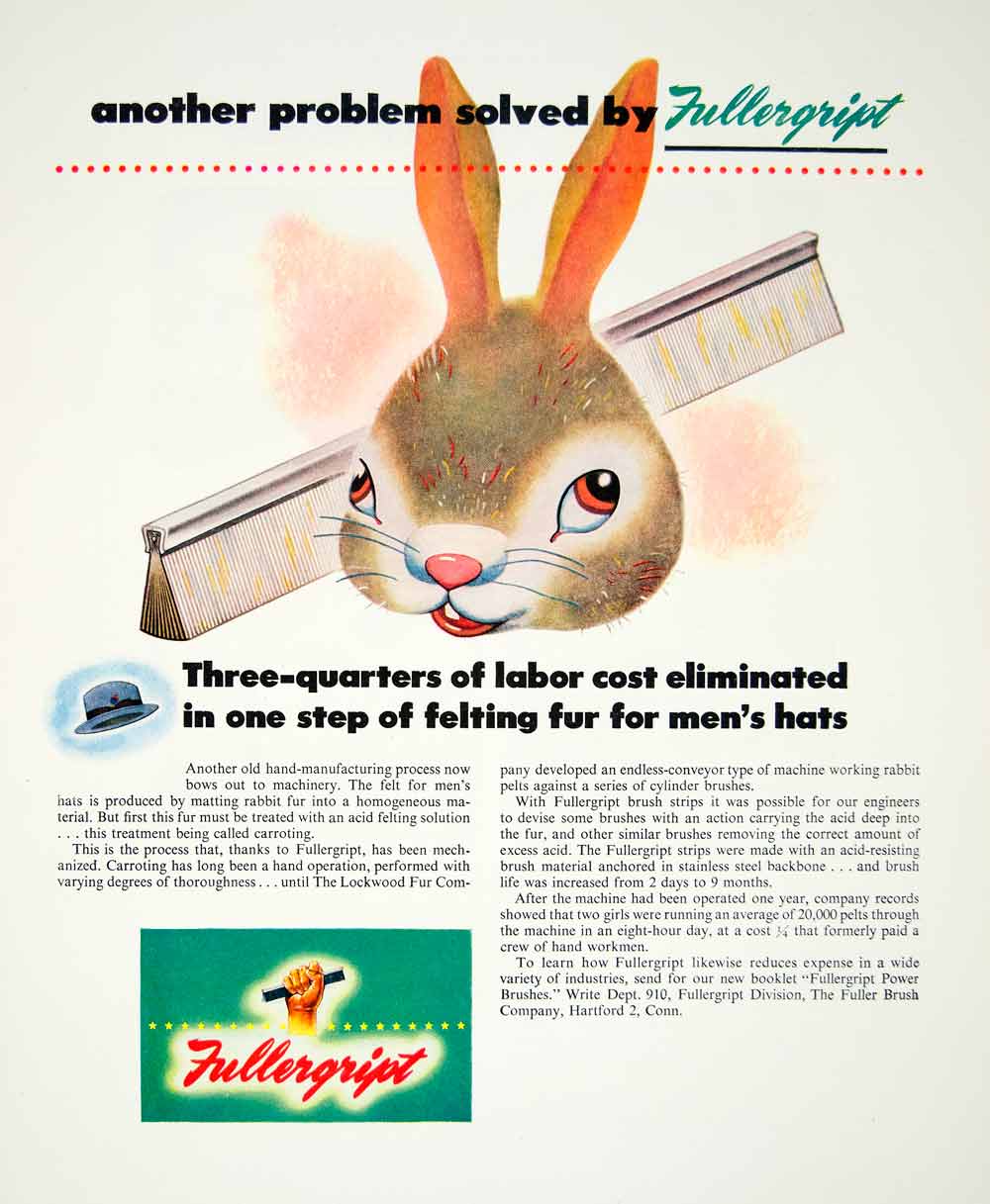 This is an original 1947 color print ad for the Fullergript Hat Brushes.