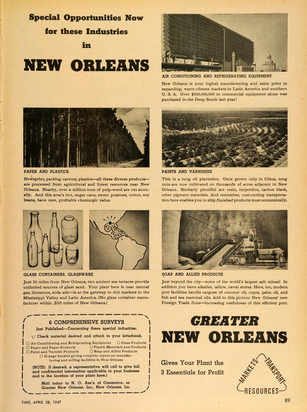 This is an original 1947 black and white print ad from the New Orleans Association of Commerce promoting industrial opportunities available in the greater New Orleans area including paper and plastics; glass containers and glassware; air conditioning and refrigerating equipment; paints and varnishes; and soap and allied products.