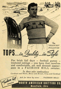 This is an original 1947 black and white print ad for the Fashion Hill Sweaters from North American Knitting Company located in Mansfield, Ohio.