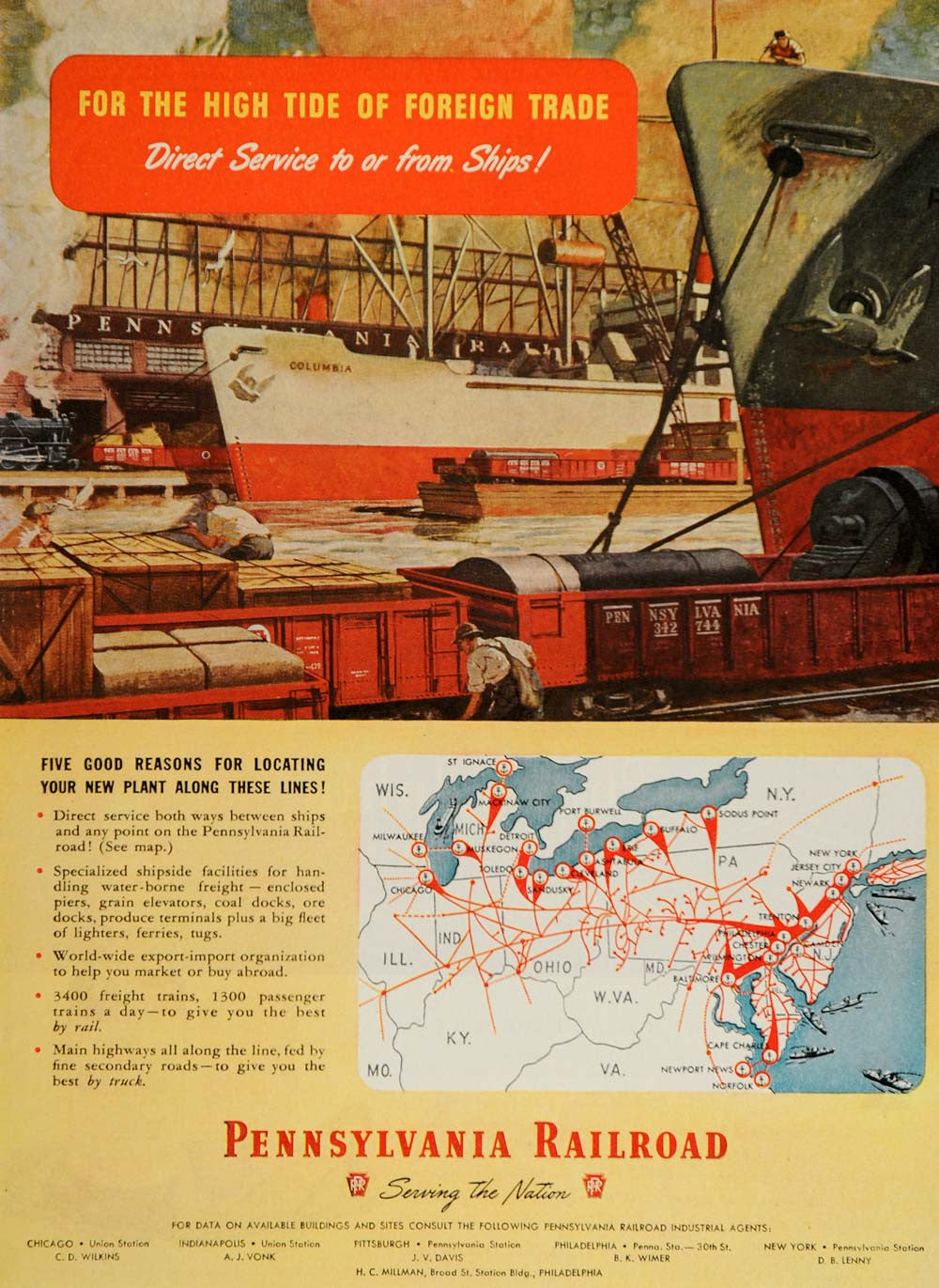 This is an original 1947 color print ad for the Pennsylvania Railroad.