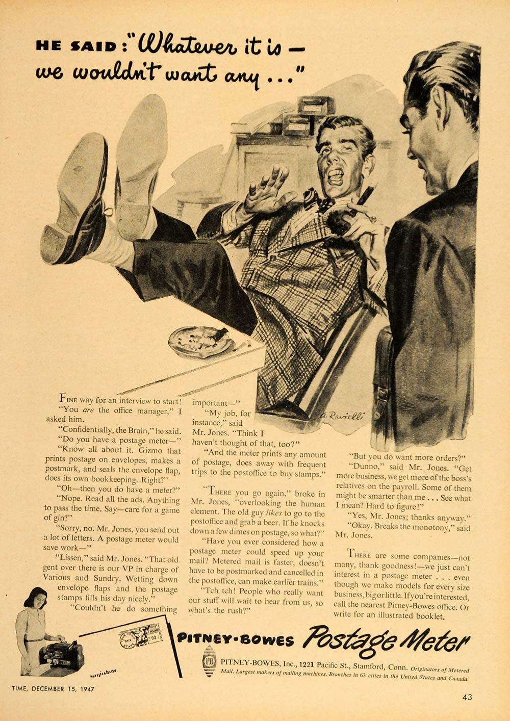 This is an original 1947 black and white print ad for the Pitney-Bowes Postage Meter from Pitney-Bowes, Inc., 1221 Pacific St., Stamford, Connecticut.