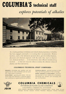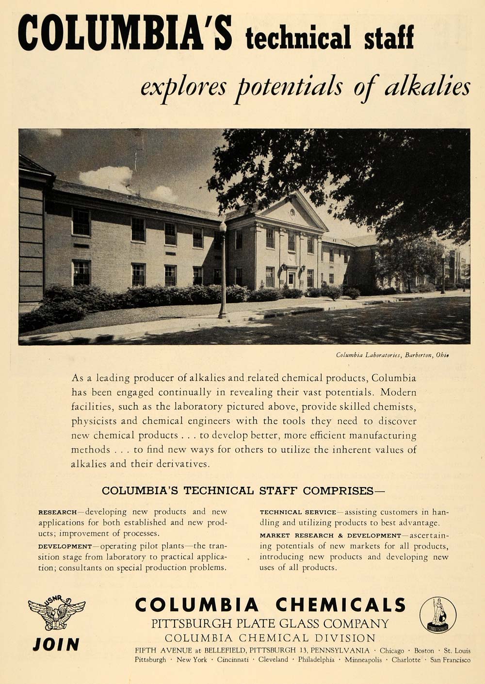 This is an original 1947 black and white print ad for the Columbia Chemicals from Pittsburgh Plate Glass Company located on Fifth Avenue, Bellefield, Pittsburgh.