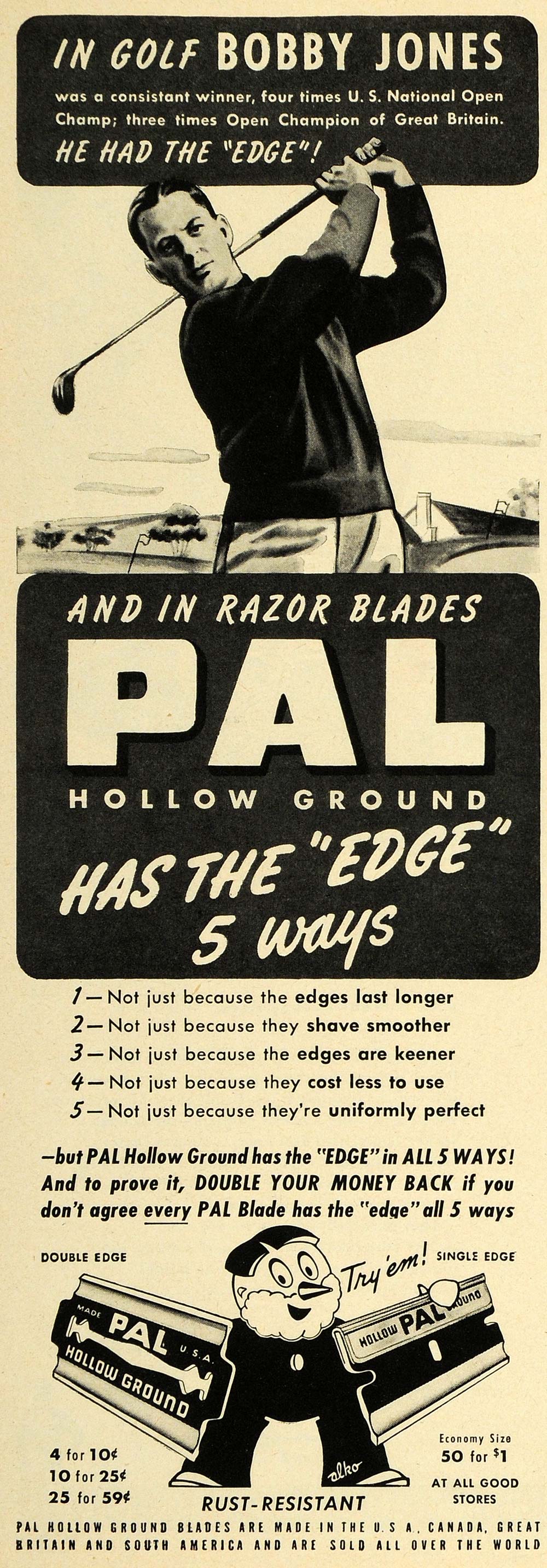 This is an original 1947 black and white print ad for Pal Hollow Ground Razor Blades.