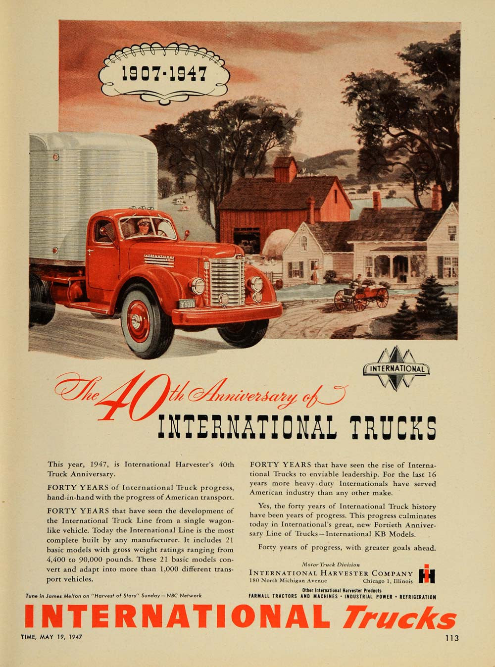 This is an original 1947 two-color print ad celebrating the 40th Anniversary of International Trucks (1907 - 1947).