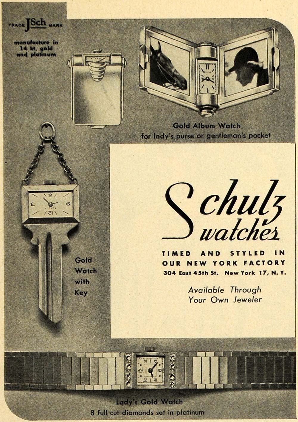 This is an original 1947 black and white print ad promoting the Gold Album Watch, Gold Watch Key, and the Lady's Gold Watch from Schulz Watches located at 304 East 45th Street, New York.