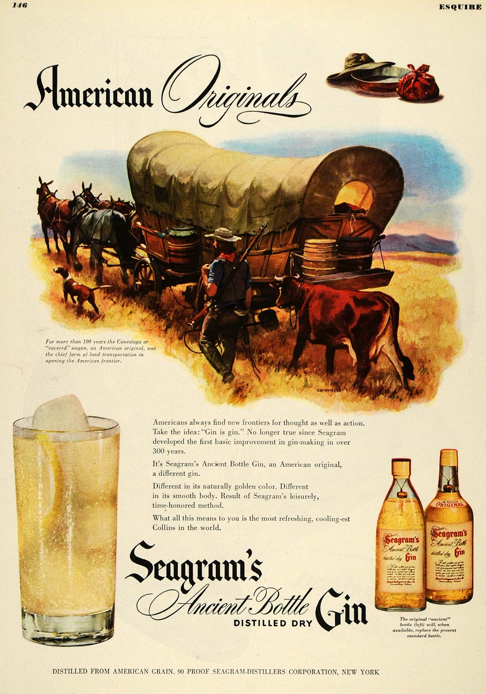 This is an original 1947 color print ad for Seagram's Gin. The ad features an image of a man walking next to his covered wagon.