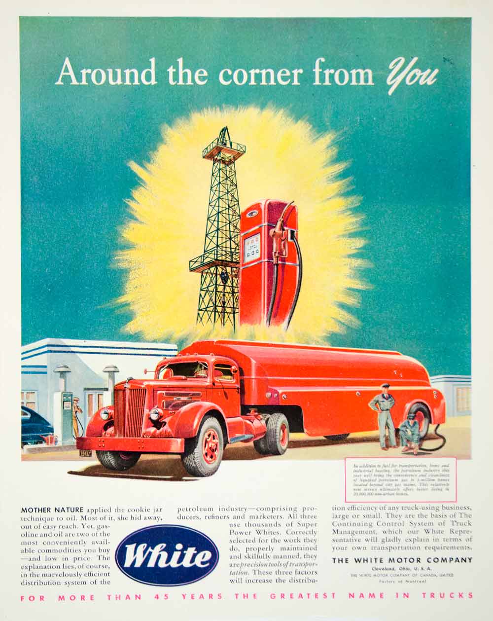 This is an original 1947 color print ad for the White Motor Company, who transported fuel across America.