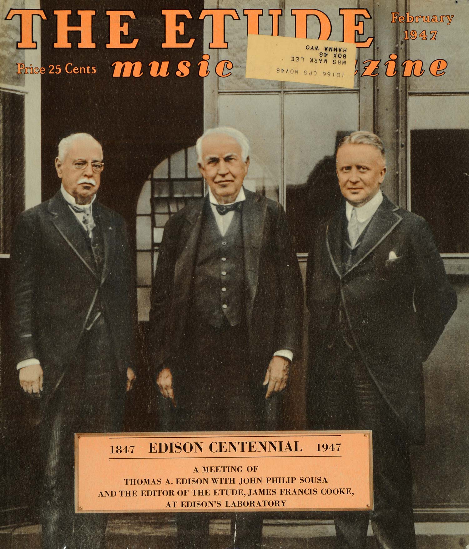 This is an original 1947 color cover for The Etude Music Magazine. Pictured on the cover are Thomas A. Edison, John Philip Sousa, and the Editor of the Etude, James Francis Cooke, at the Edison Laboratory. The cover commemorates the Edison Centennial (1847 - 1947).