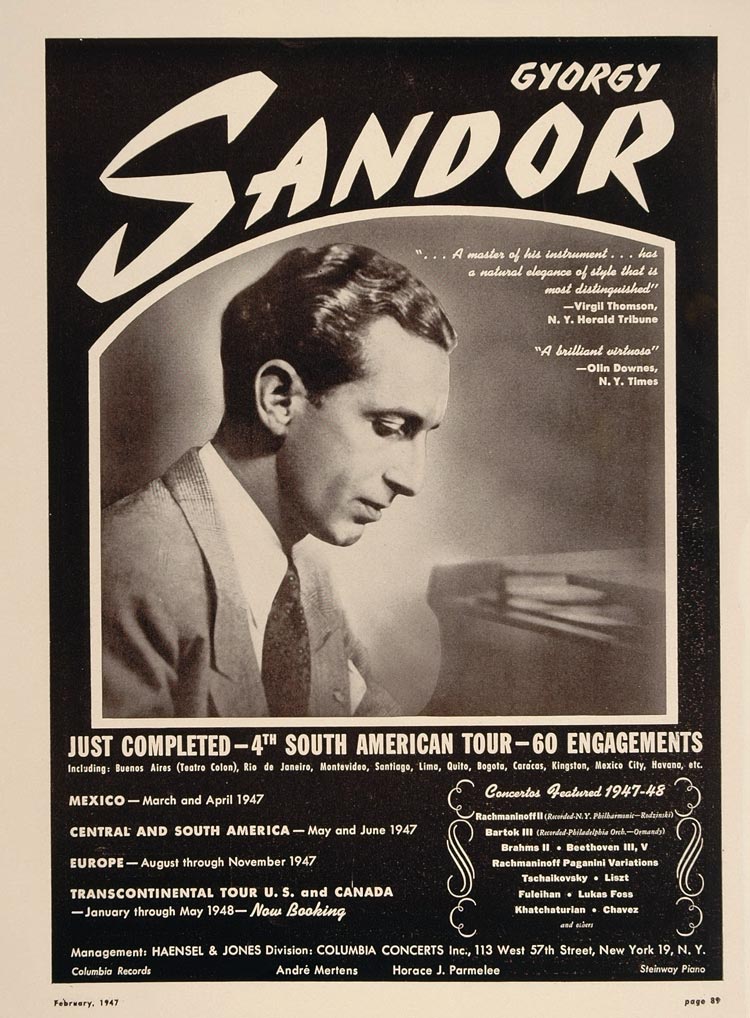 Original black and white 1947 booking ad for Gyorgy Sander, pianist. Management: Haensel & Jones.