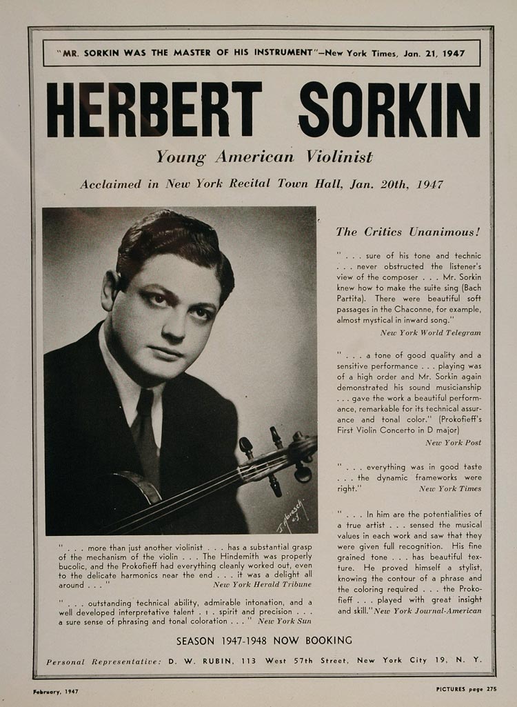 Original black and white 1947 booking ad for Herbert Sorkin, violinist. Personal Representative: D. W. Rubin.