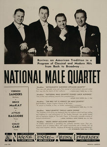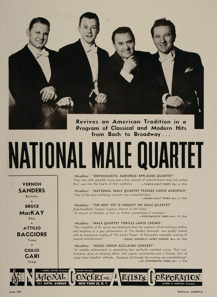 Black and white 1947 booking ad for the National Male Quartet with Vernon Sanders, baritone, Bruce MacKay, bass, Attilio Baggiore, tenor, and Giulio Gari, tenor. Management: National Concert and Artists Corporation.