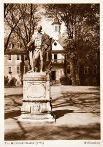 This is an original 1947 black and white photogravure of Governor Botetourt Statue at The College of William and Mary's Wren Builiding in Williamsburg, Virginia. Norman Berkeley, Baron de Botetourt, was Royal Governor of Virginia from 1768-1770. Well liked by the colonists, he was interned beneath the Wren Building. His obituary described Botetourt as "the best of Governours and the best of men."