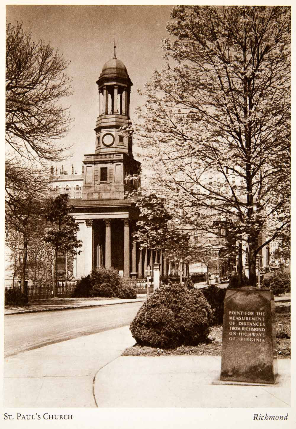 This is an original 1947 black and white photogravure of St. Paul's Church in Richmond, Virginia. Located across the Virginia State Capitol, St. Paul's church was built in 1845 as a branch of the Monumental Church. It was designed by Thomas S. Steward in the Greek Revival style.