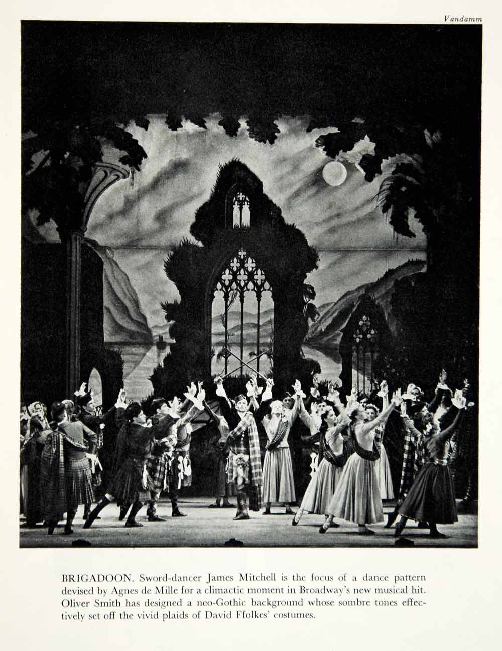 This is an original 1947 black and white halftone print of sword-dancer James Mitchell in the 1947 Broadway musical "Brigadoon", by Alan Jay Lerner and Frederick Loewe.