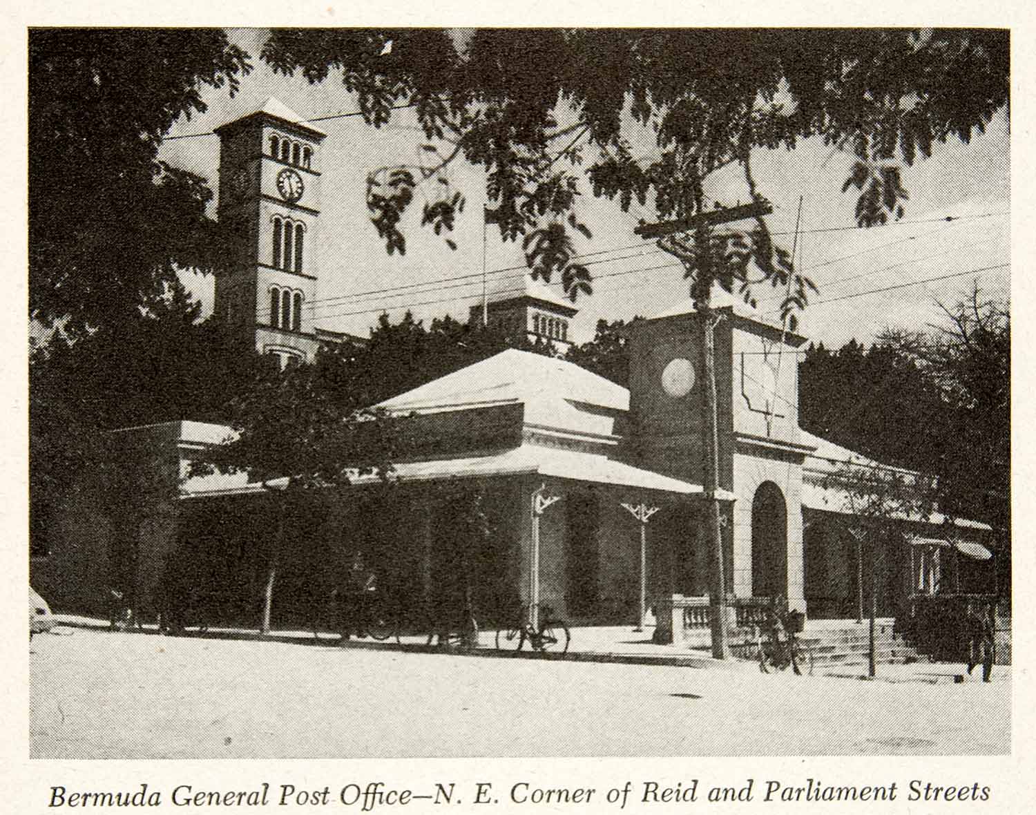 This is an original 1947 black and white halftone print of the Bermuda General Post Office building on the northeast corner of Reid and Parliament Streets in Hamilton, Bermuda.