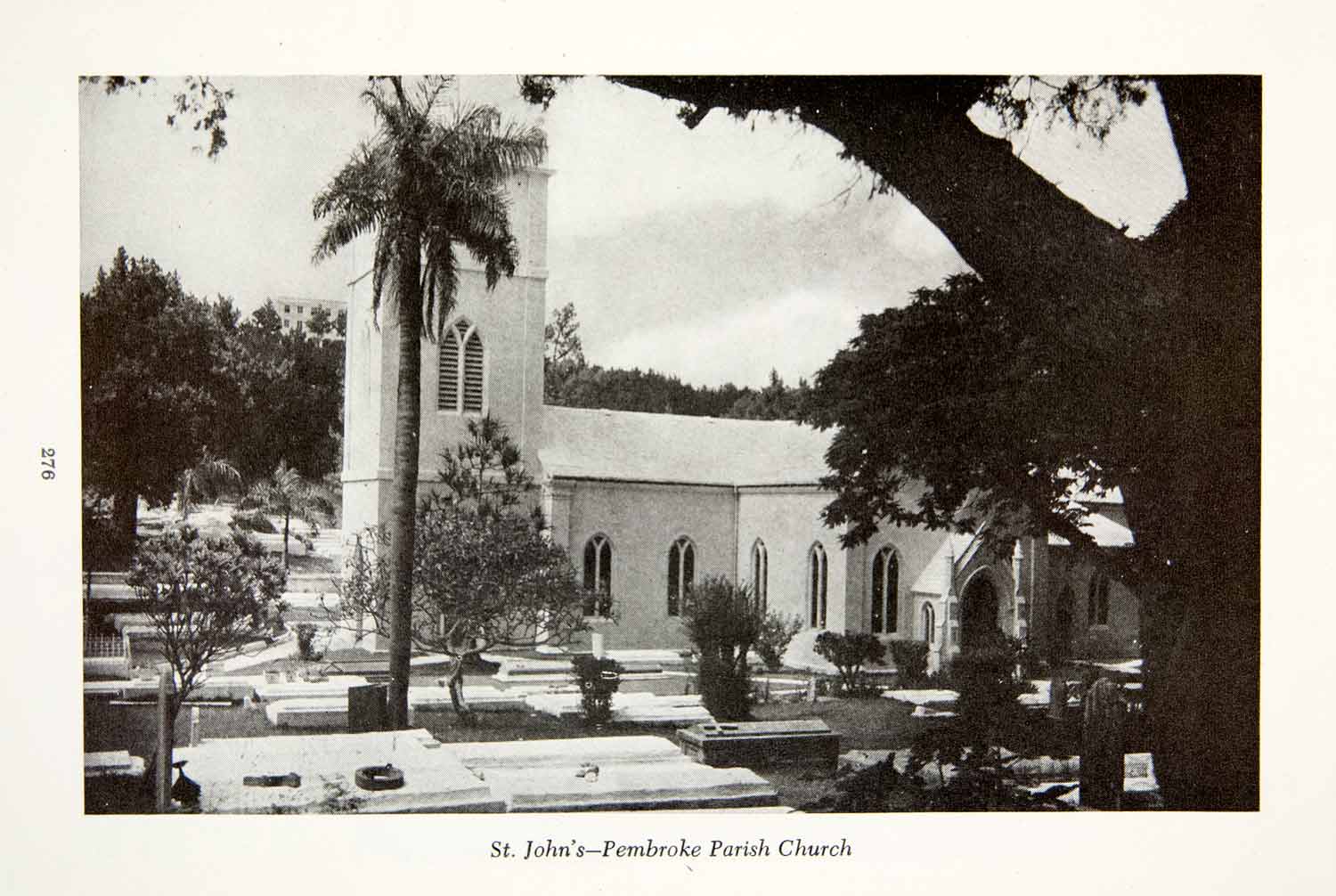 This is an original 1947 black and white halftone print of St. John's Anglican Church in Hamilton, Bermuda. This historic church was originally erected in 1625, making it one of the oldest parish churches on the island.