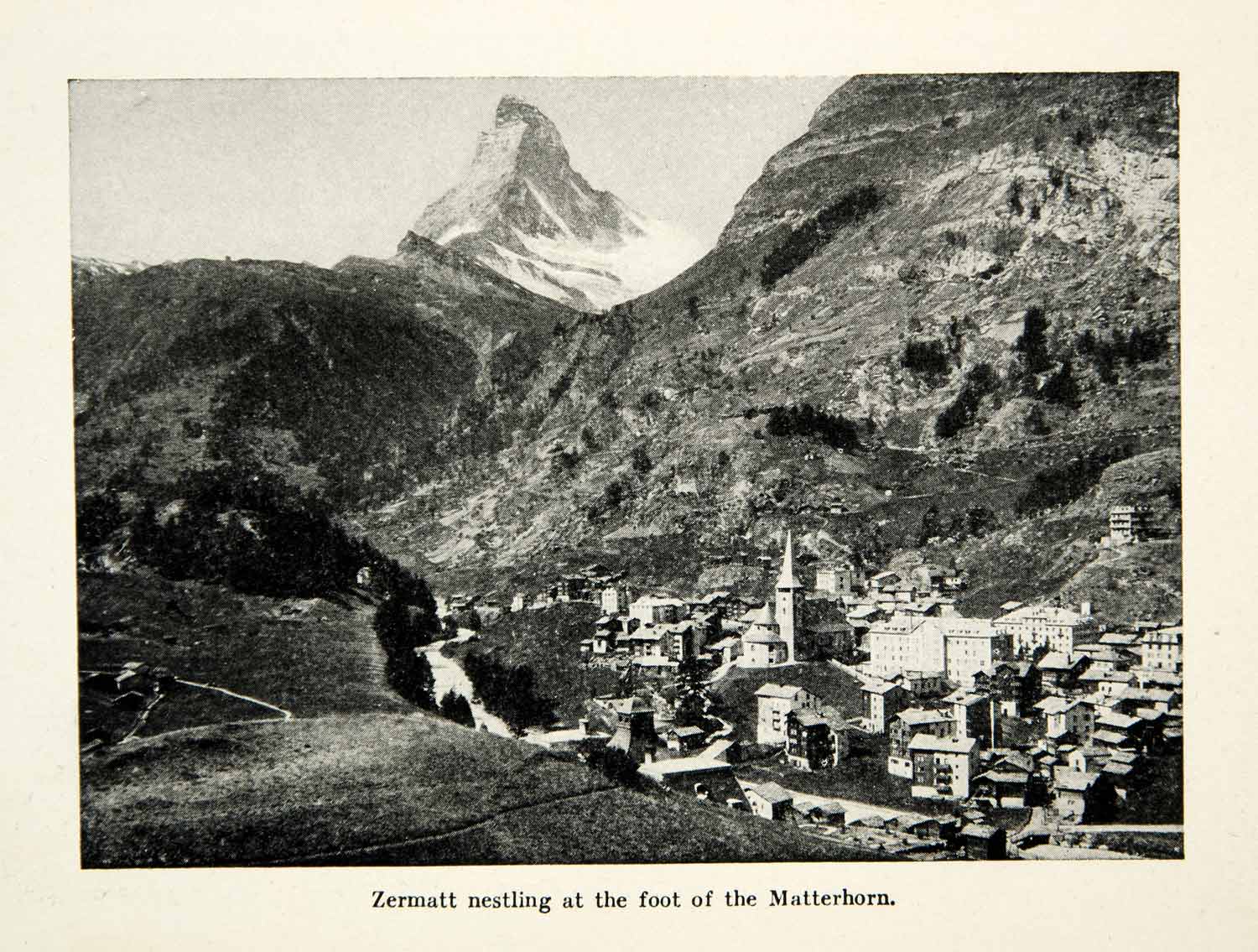 This is an original 1947 black and white halftone print of Zermatt, nestled in the Swiss Alps. The Matterhorn can be seen in the distance.