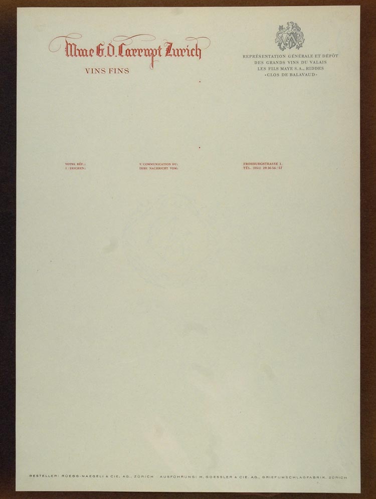 This is an original 1947 sample piece of letterhead for Mme. G. O. Carrupt (?) Zurich, Vins Fins. (We are not sure if we have spelled the name correctly.) This piece is lightly glued at the corners to a brown mounting board.
