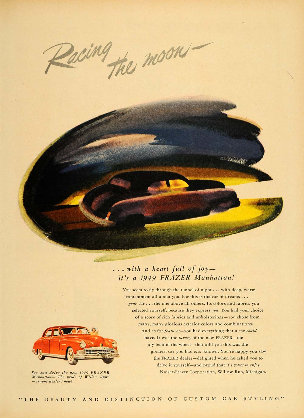 This is an original 1948 color print ad for the 1949 Frazer Manhattan luxury automobile from the Kaiser-Frazer Corporation of Willow Run, Michigan.