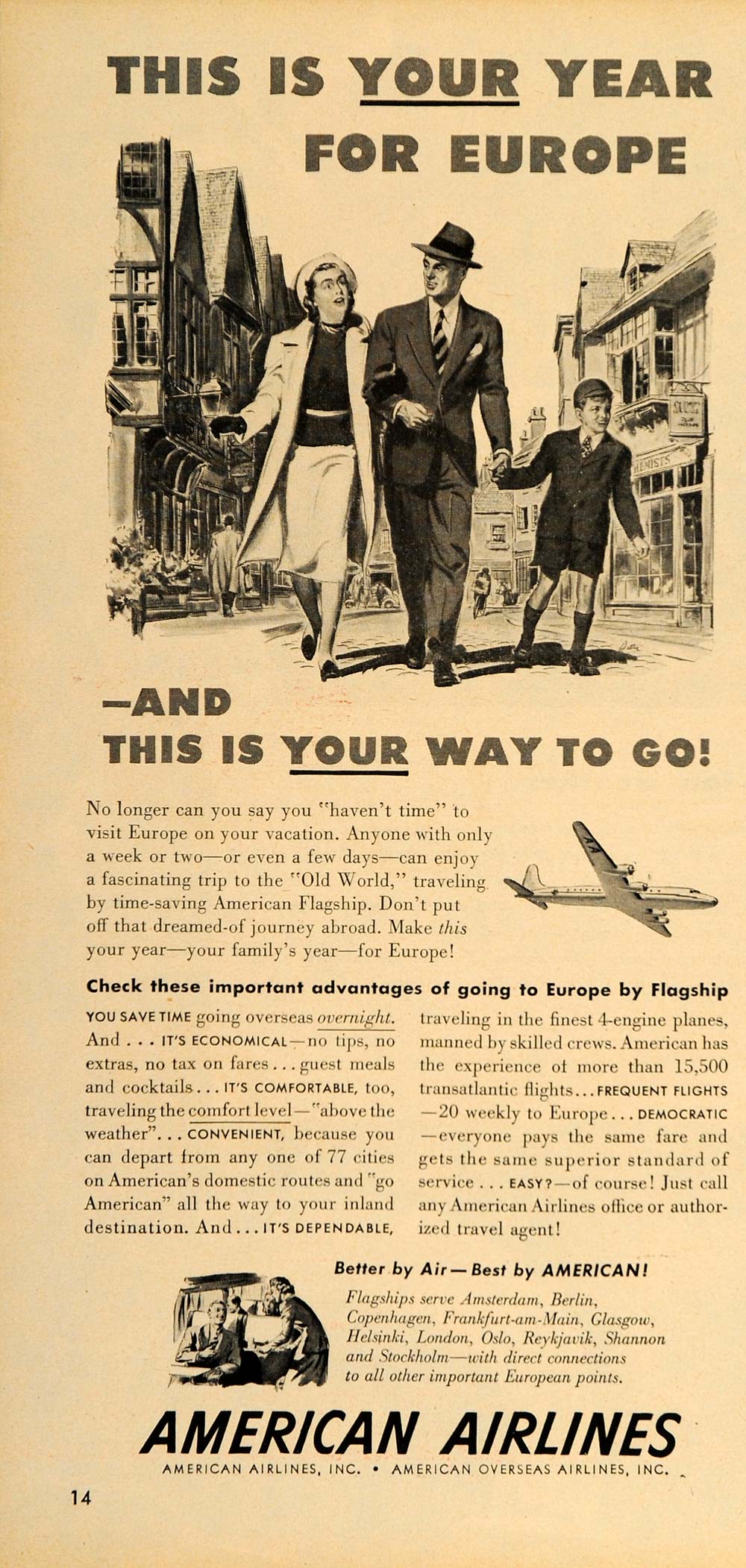 This is an original 1948 black and white print ad for air travel to Europe via American Airlines' Flagship airplanes.