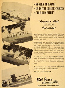 This is an original 1948 black and white print ad for the Bob Jones University located in Greenville, South Carolina. It is a Christian University and has courses in music, speech, and art.