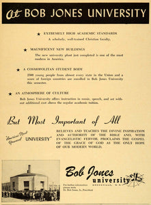 This is an original 1948 black and white print ad for the Bob Jones University located in Greenville, South Carolina. Dr. Bob Jones, Jr. is the president of the University.