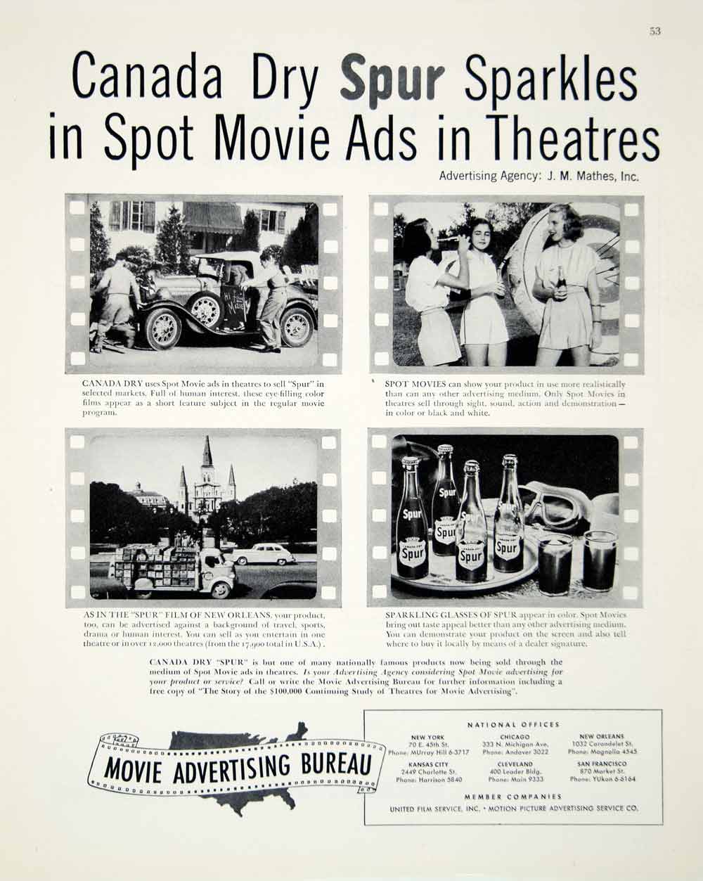 This is an original 1948 black and white print ad for Canada Dry's Spur soda, and the movie advertising campaign that made it so popular.