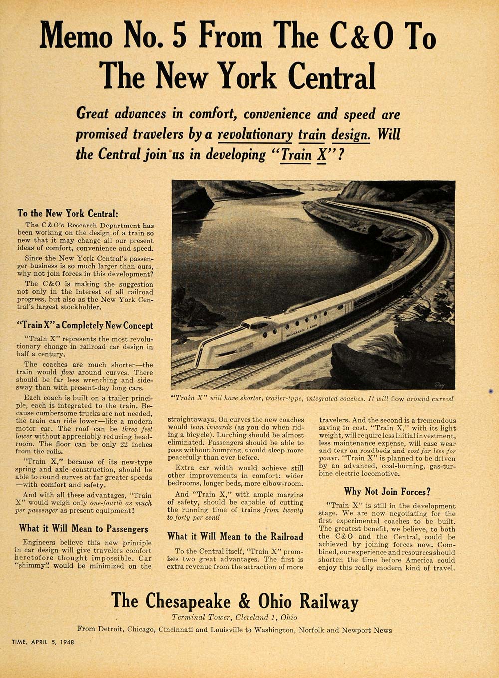 This is an original 1948 black and white print ad for the Chesapeake & Ohio Railway in the form of a memo to the New York Central Railroad about developing "Train X."
