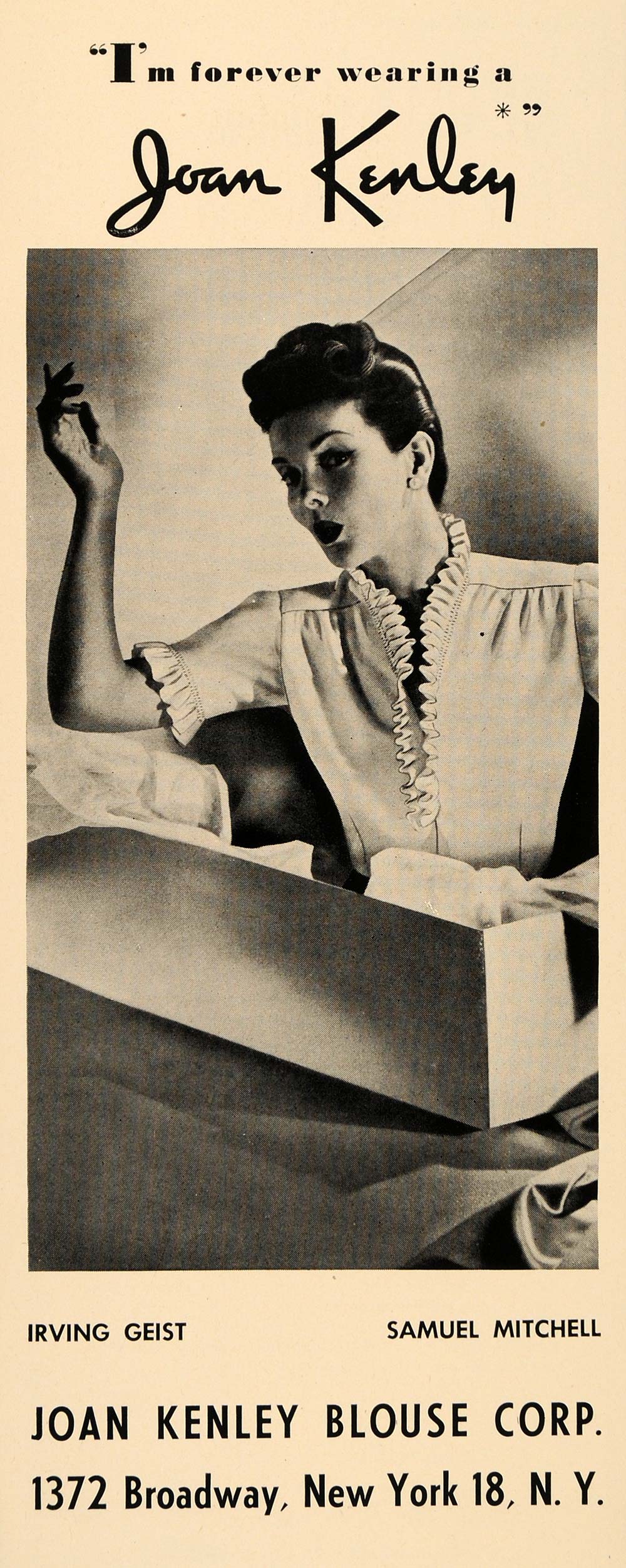 This is an original 1948 black and white print ad for ladies blouses from the Joan Kenley Blouse Corp., 1372 Broadway, NYC.