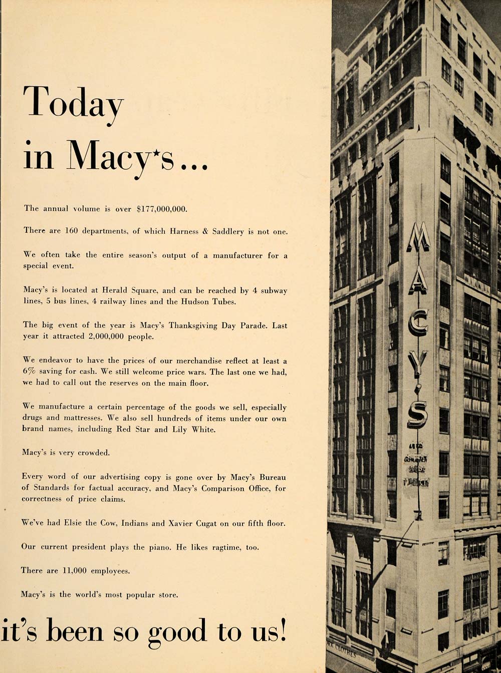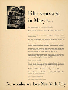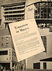 This is an original 1948 black and white three-page print ad for Macy's department store in New York City with images of their store at 14th Street and 6th Avenue as well as images of their flagship store at Herald Square and other stores in Flatbush, White Plains, Parkchester, and Jamaica. Each page measures 9.5 x 15.5 inches --please see all images.