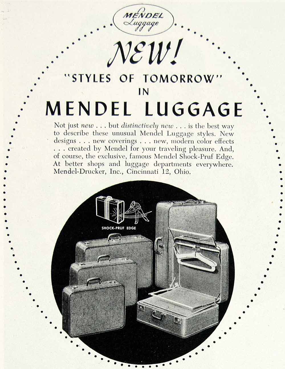 This is an original 1948 black and white print ad for Mendel Luggage.