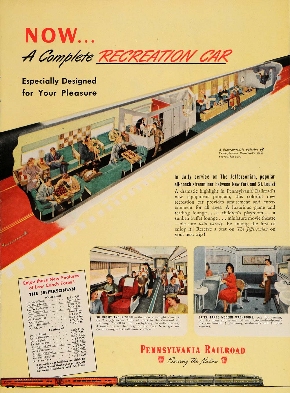 This is an original 1948 color print ad for the new Recreation Car on The Jeffersonian, the Pennsylvania Railroad's all-coach streamliner with daily service between New York and St. Louis. The ad has a nice diagrammatic illustration of this new car. This is an excellent original print item for the collector of authentic railroadiana!
