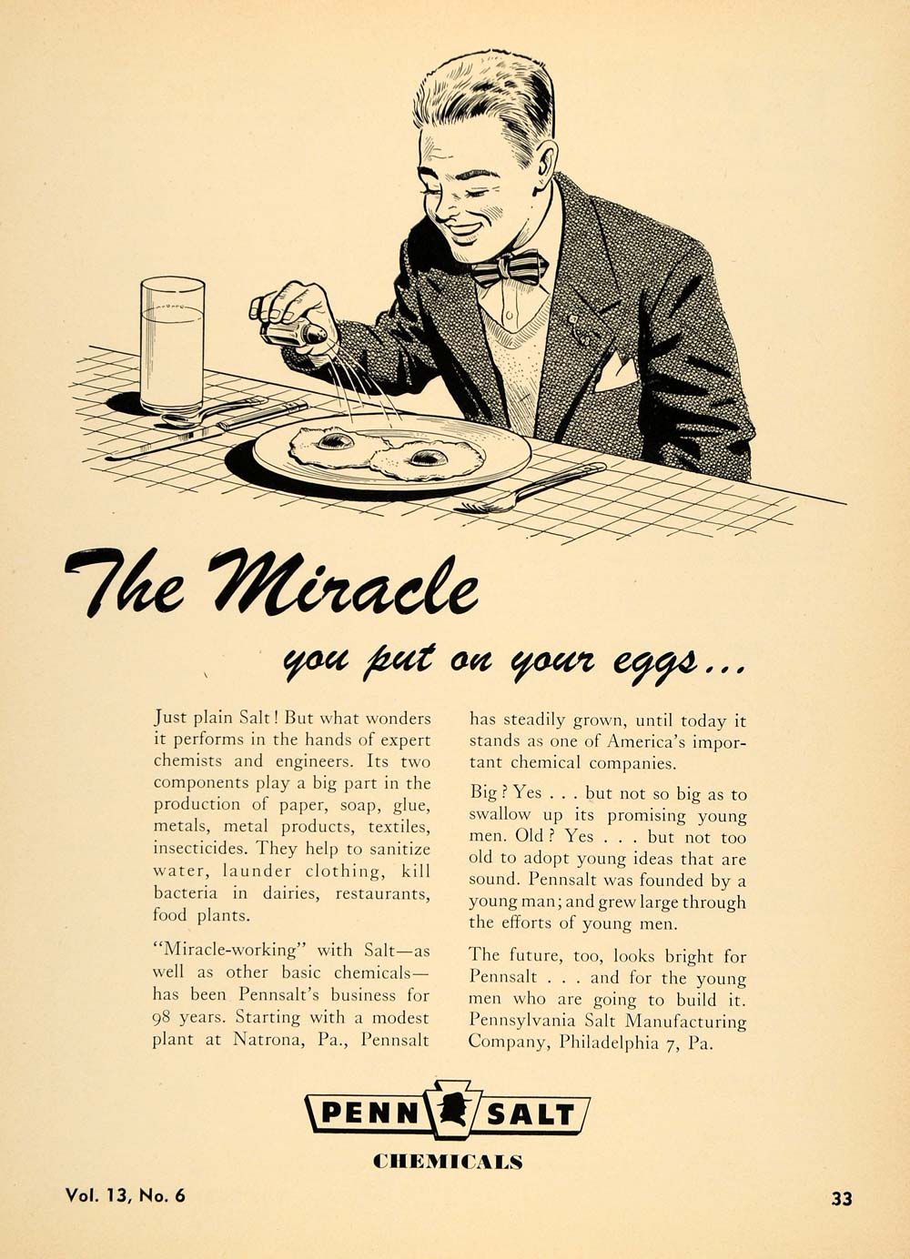 Keywords specific to this image: Vintage Advertising, eggs, food, spice, sodium, chemistry, breakfast, meal, eating, eat, table, man, plate, Pennsalt, salty, flavor