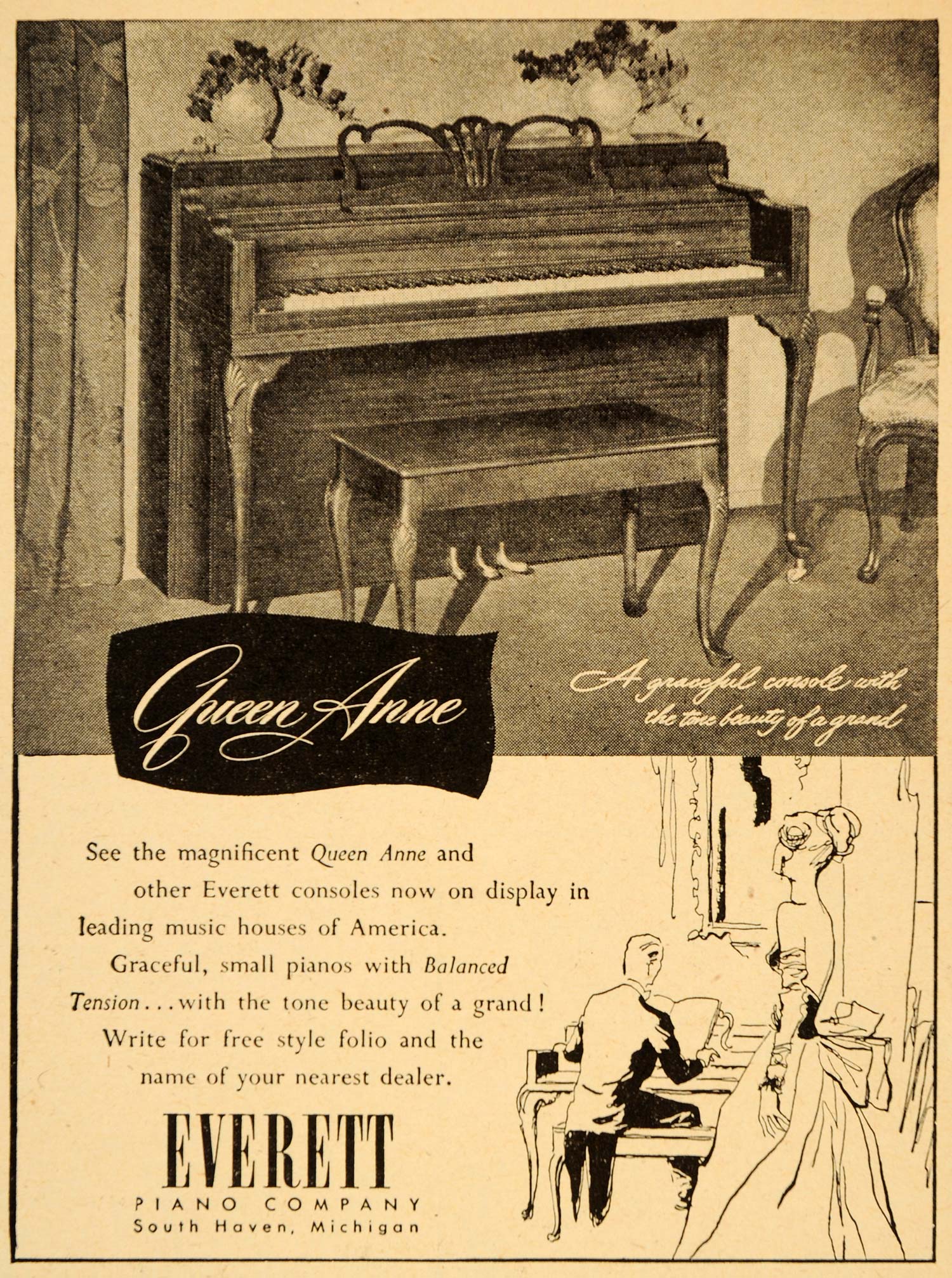 This is an original 1948 black and white print ad for the Queen Anne Everett Console Piano distributed by the Everett Piano Company of South Haven, Michigan.