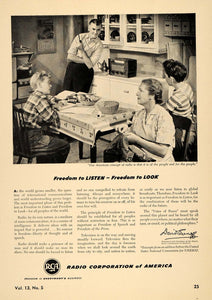 This is an original 1948 black and white print ad for the Radio Corporation of America, located in Radio City, New York. This ad features their RCA radios and transmissions and the upcoming popularity of the television set. This ad features, as well, a textual excerpt of an address given to the United States National Commission for UNESCO (the United Nations Educational, Scientific, and Cultural Organization).