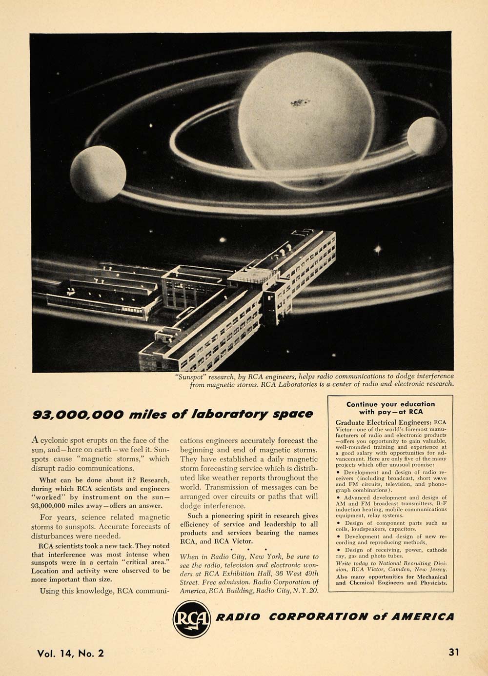 This is an original 1948 black and white print ad for the Radio Corporation of America, located at the RCA Building of Radio City, New York. This ad features their RCA scientists that have used technology to forecast storms in space around the sun.