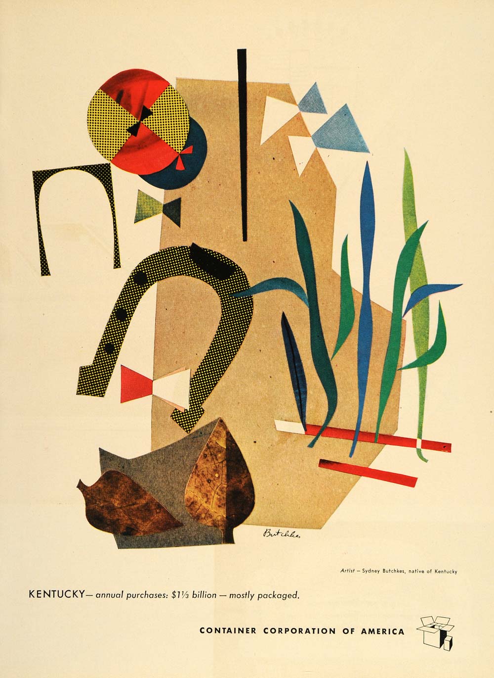 This is an original 1948 color print ad for Container Corporation of America (CCA) with a symbolic representation of the State of Kentucky by Kentuck native artist, Sydney Butchkes.