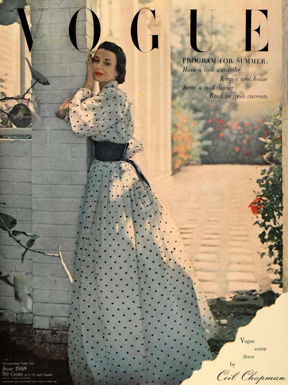 This is an original 1948 color print ad for Vogue Magazine which features a lovely summer gown by fashion designer, Ceil Chapman.