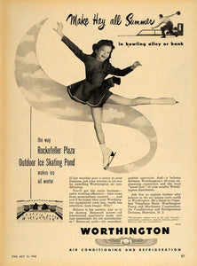 This is an original 1948 black and white print ad for Worthington Air Conditioning and Refrigeration equipment with a nice image of a little girl figure skating.