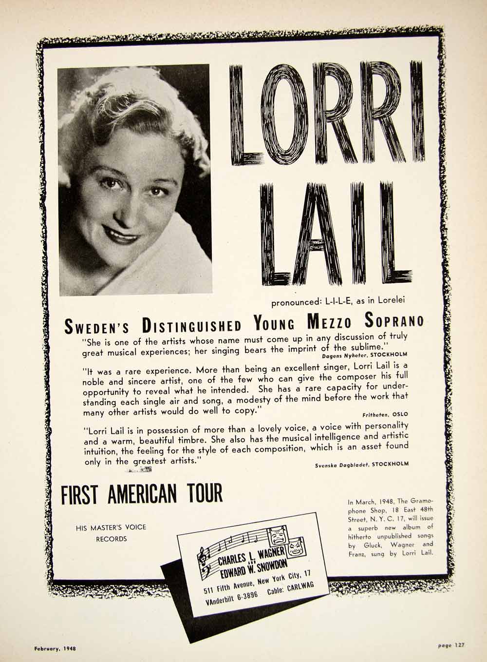 This is an original 1948 black and white booking ad for the first American tour of Norwegian-born mezzo soprano, Lorri Lail (1904-1978). Management: Charles L. Wagner & Edward W. Snowdon.