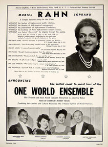 This is an original 1948 black and white booking ad for the African-American soprano singer, Muriel Rahn (1911-1961) and the coast to coat tour of the One World Ensemble with Napoleon Reed, tenor; Hideko Yoshino, soprano; Elizabeth Dunning, contralto; and Burton Cornwall, basso. Management: Dick Campbell.