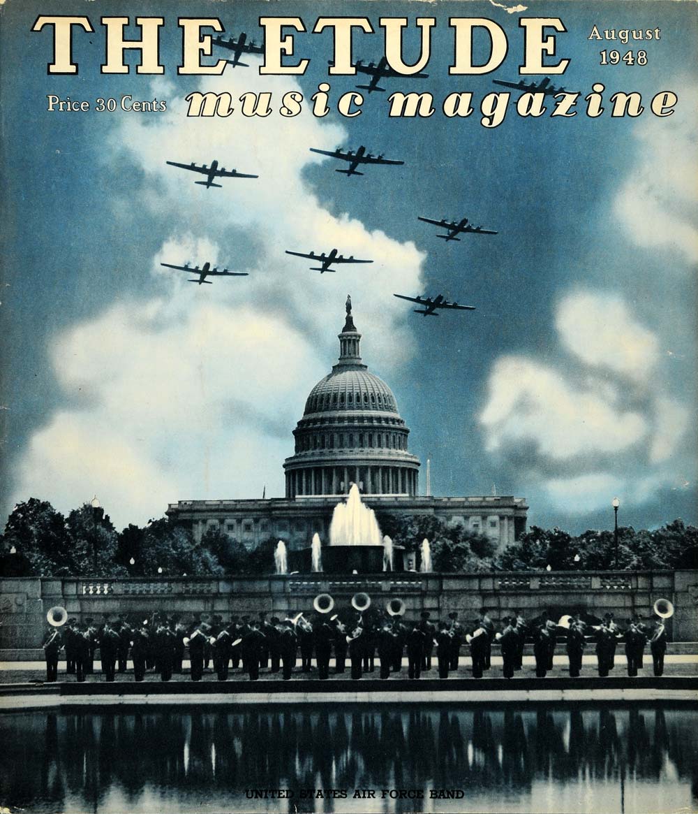 This is an original 1948 color cover for The Etude Music Magazine. The cover pictures the United States Air Force Band in front of the capitol building in Washington, D.C. Also pictured are military planes flying overhead.