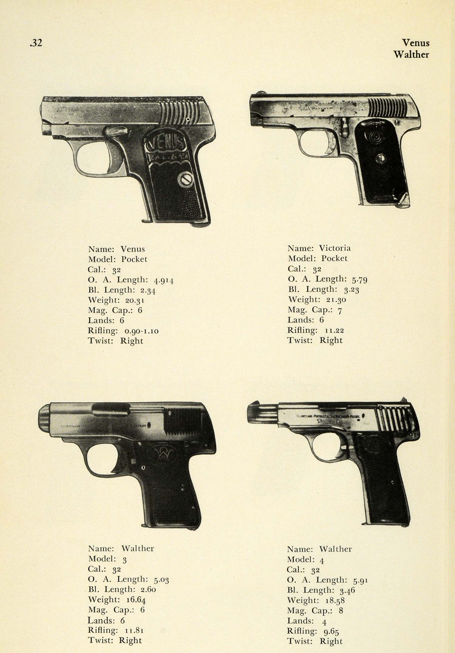 This is an original 1948 halftone print of the 32 caliber Venus Pocket Model, the 32 Victoria Pocket Model, the 32 Caliber Walther Model 3 and Walther Model 4 pistols.
