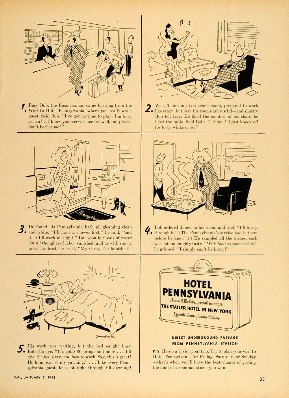 This is an original 1948 black and white print ad for the Hotel Pennsylvania in New York City.