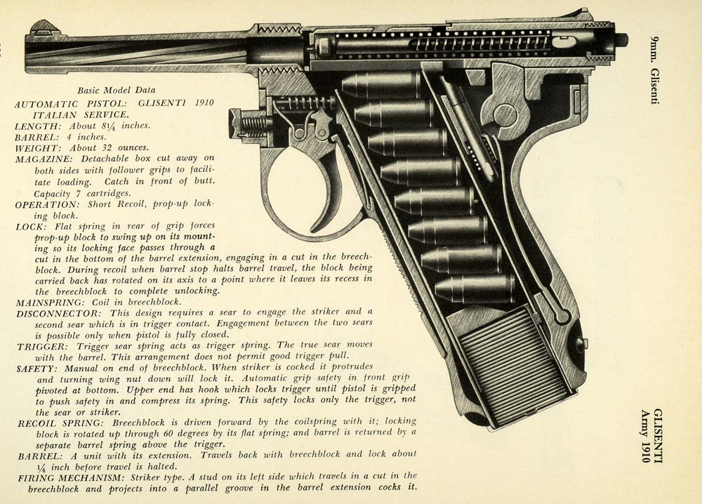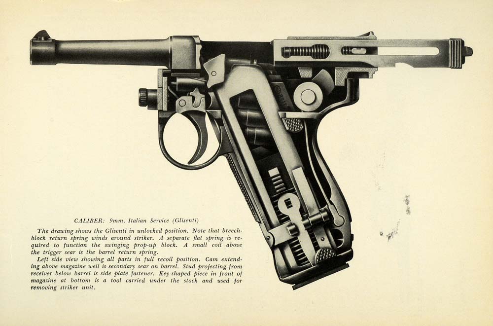 This is an original 1948 two-page halftone print set (two single-sided pages) of the Army 1910 Italian Service 9 mm Gilsenti Automatic Pistol. Please see additional image.