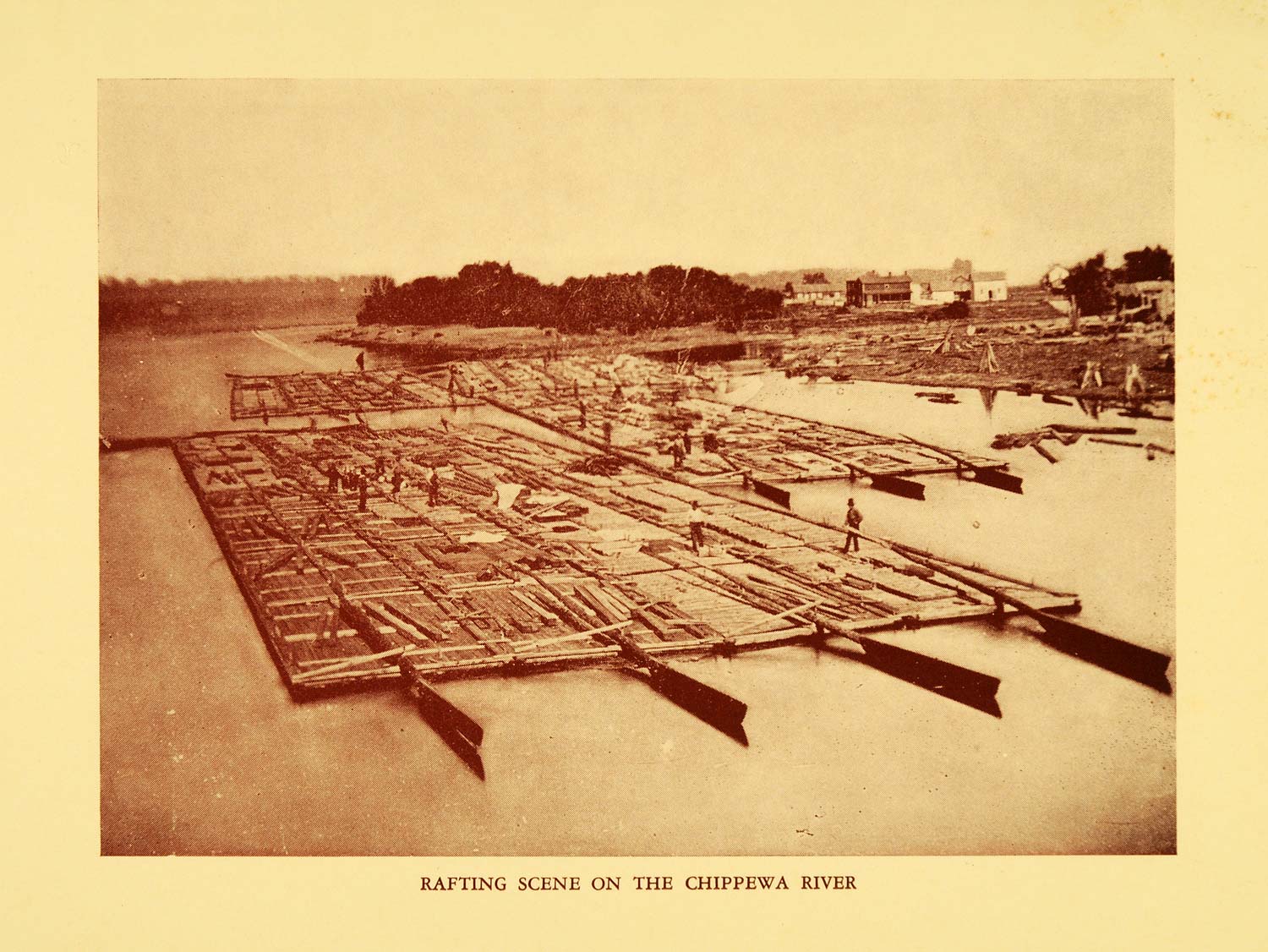 This is an original 1948 halftone print featuring a rafting scene on the Chippewa River in Wisconsin.