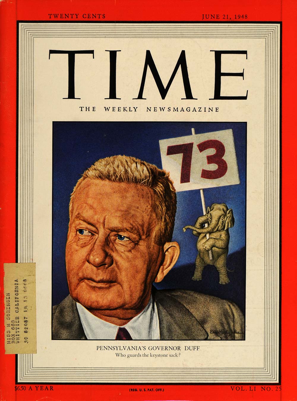 1948 TIME Cover Governor James H. Duff PA Elephant - ORIGINAL TM1