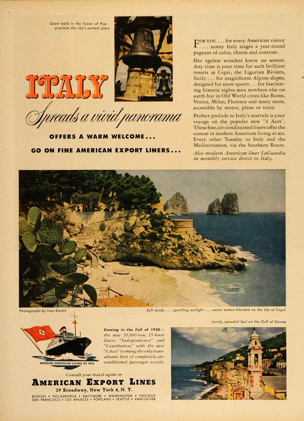 This is an original 1949 color print ad for cruise travel to Italy via American Export Lines, 39 Broadway, NYC. Photographs by Ivan Dmitri.