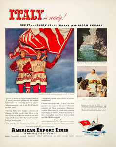 This is an original 1949 color print ad for the American Export Lines, encouraging travel to Italy.